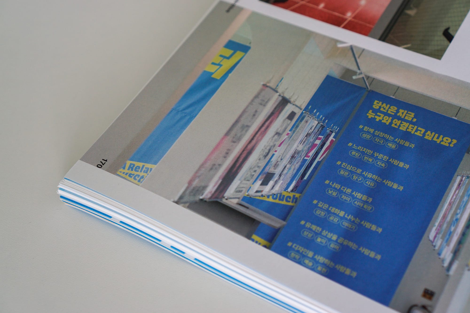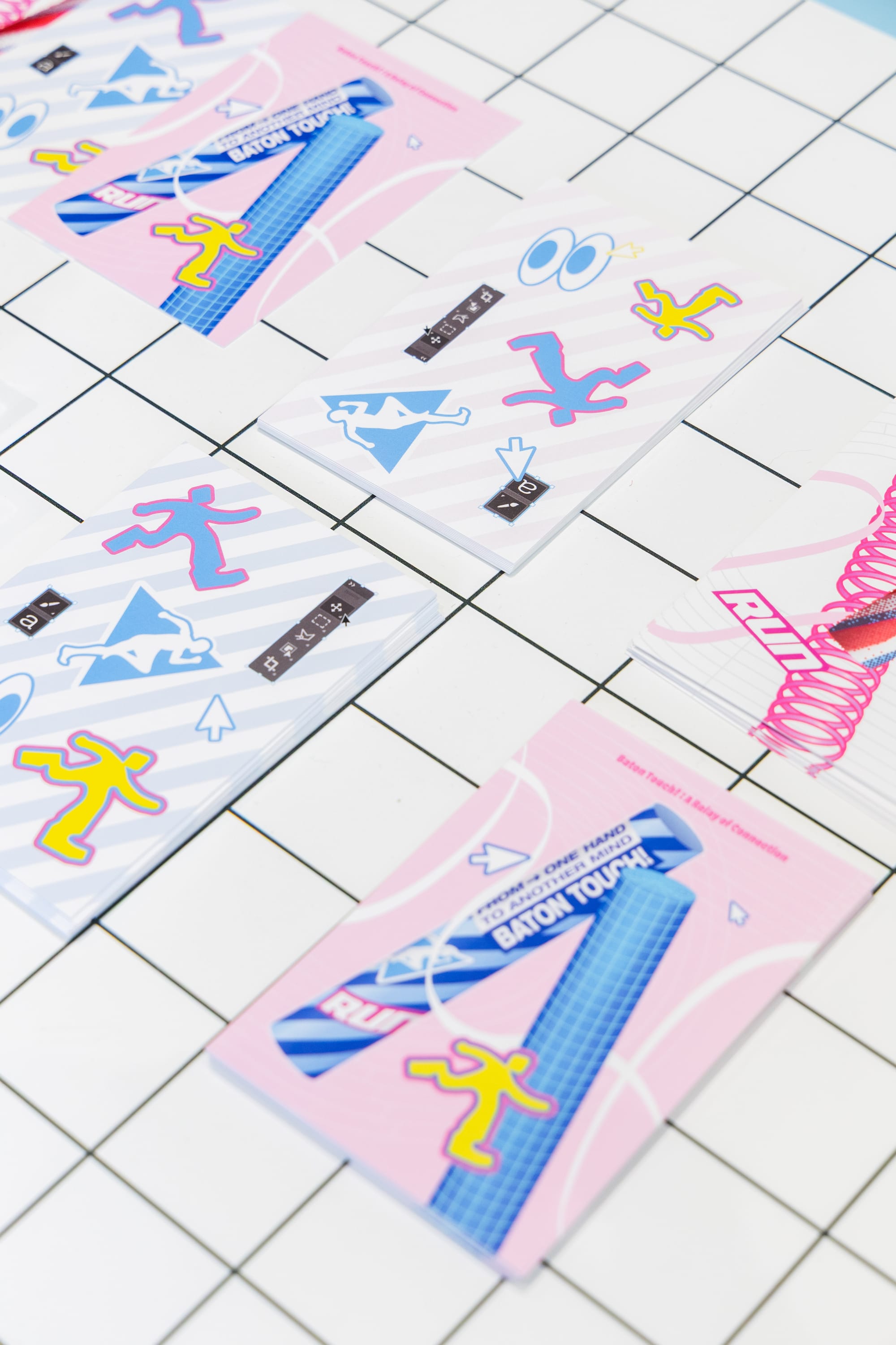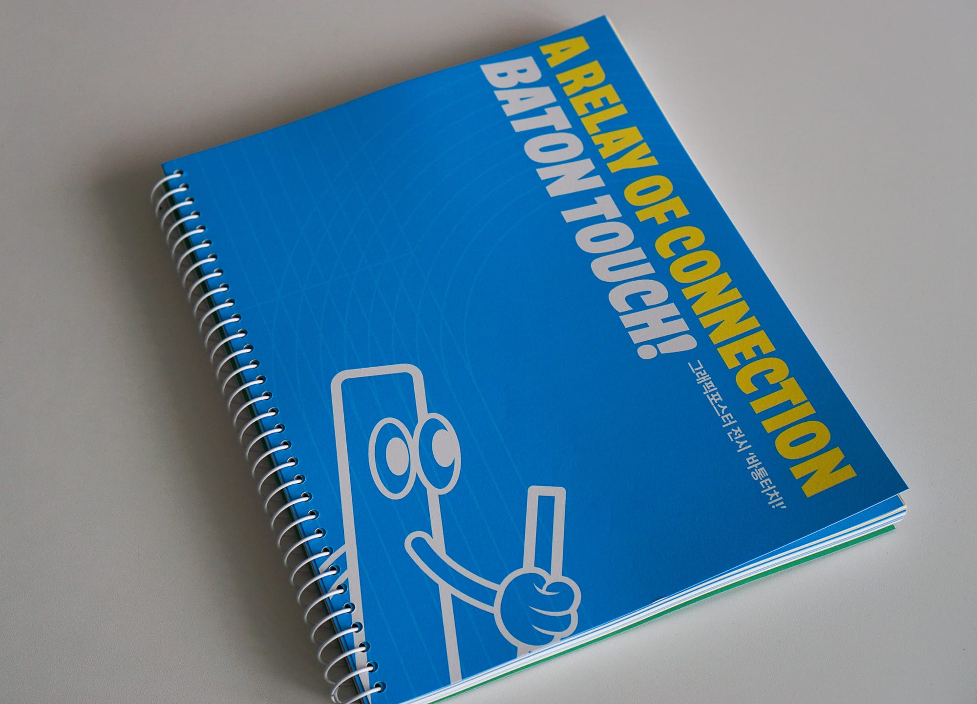 《바통터치!》 도록은 전시의 시작부터 완주까지의 전체 여정을 한 권에 담았습니다. 전시 서문, 기획 과정, 공간 도면, 전경, 그리고 48인의 디자이너가 만들어낸 그래픽 포스터와 설문, 방명록, 후일담까지. 전시의 모든 순간이 이 책 안에서 이어집니다.