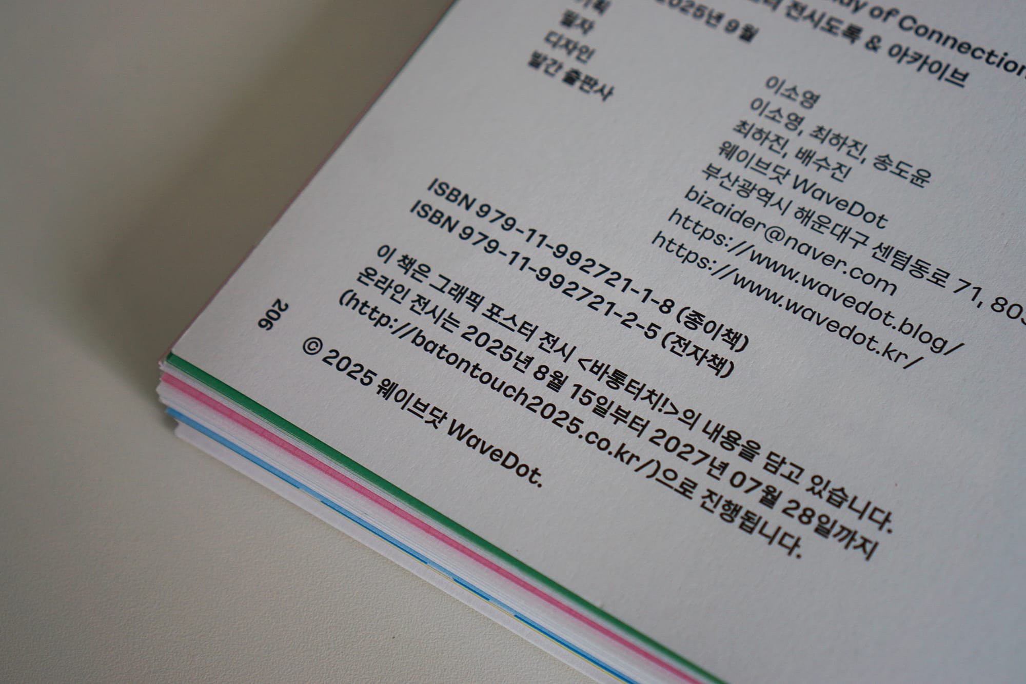 바통터치 그래픽 포스터 전시도록& 아카이브 북은 2025년 여름 부산에서 열린 48인의 디자이너와 함께한 그래픽 포스터 전시의 모든 순간을 담은 도록입니다.